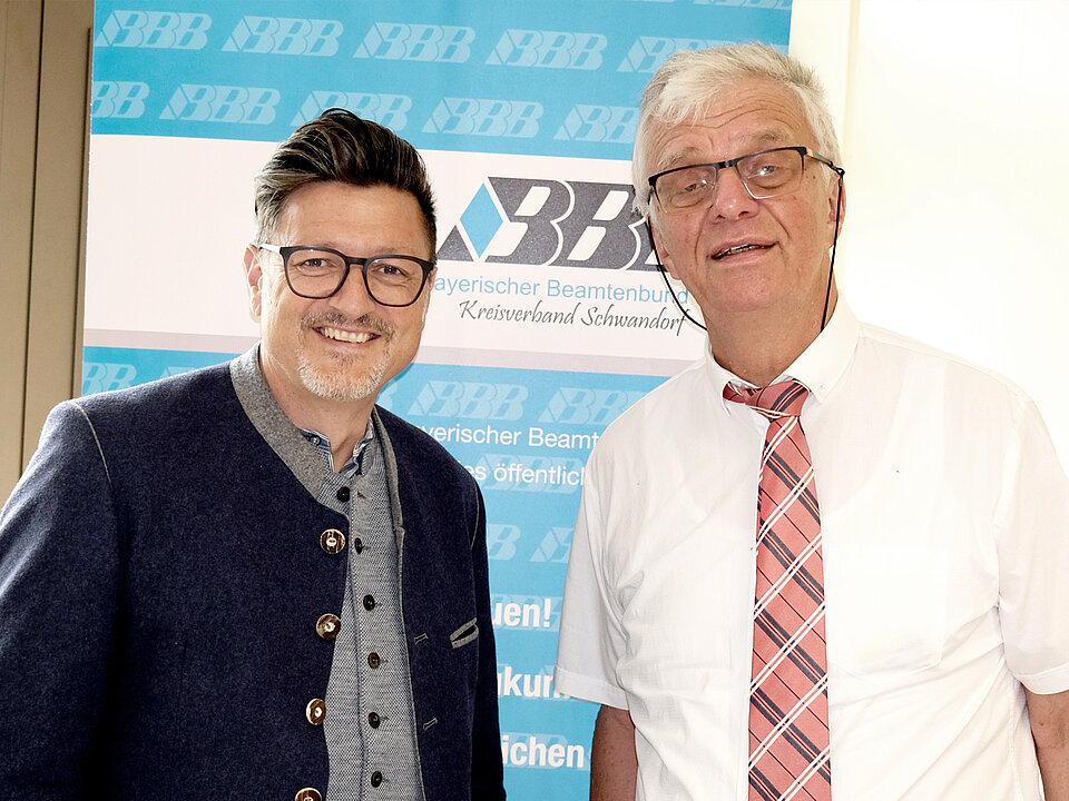 Traditionell haben sich die Ausschussvorsitzenden für Fragen des öffentlichen Dienstes im Bayerischen Landtag die Klinke beim BBB-Kreisausschuss Schwandorf in die Hand gegeben. Der eloquente, ungezwungene und freundliche 48-jährige ehemalige Leiter des Schulzentrums Freilassing, Dr. Martin Brunnhuber (links im Bild), ist von der 37-köpfigen Fraktion der FREIEN WÄHLER im Bayerischen Landtag zum Vorsitzenden des Ausschusses für Fragen des öffentlichen Dienstes auserkoren worden. Er kennt sich aus im Schulbereich: von der Ausbildung zu den Revierjägern bis hin zu den Köchen. Der Familienvater, verheiratet mit einer Grundschullehrerin, schafft den Spagat zwischen den Forderungen der Beamten und den Zielen der Staatsregierung. Er war neugierig auf die Fragen der Teilnehmer und beantwortete sie freundlich und aufgeschlossen.