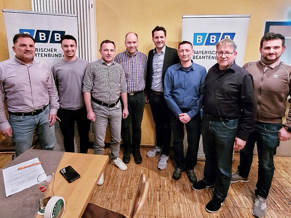 MdL Jungbauer (im Gruppenbild 5.v.l.), der unter anderem Mitglied im Ausschuss für Bildung und Kultus ist, brachte in seinem Vortrag die Verbundenheit zu den Themen des öffentlichen Dienstes zur Geltung. Als ehemaliger Polizeibeamter bringe er auch die entsprechende Erfahrung mit. Ein klares Bekenntnis zum öffentlichen Dienst sei das Ergebnis der Tarifverhandlungen und die zeit- und wirkungsgleiche Übertragung auf den Beamtenbereich in Bayern. Der mittlerweile höchste Personalkörper seit jeher sei für den Staatshaushalt aber eine große Herausforderung. Bei der Personalsituation sei ihm das Thema Teilzeit besonders wichtig. Hier sehe er Potenzial, Ressourcen zu generieren, ohne dabei die Vereinbarkeit von Familie und Beruf zu gefährden. Ein weiteres Thema ist der Bürokratieabbau. Hier seien Ideen aus dem Kreis der Beschäftigten sehr willkommen.