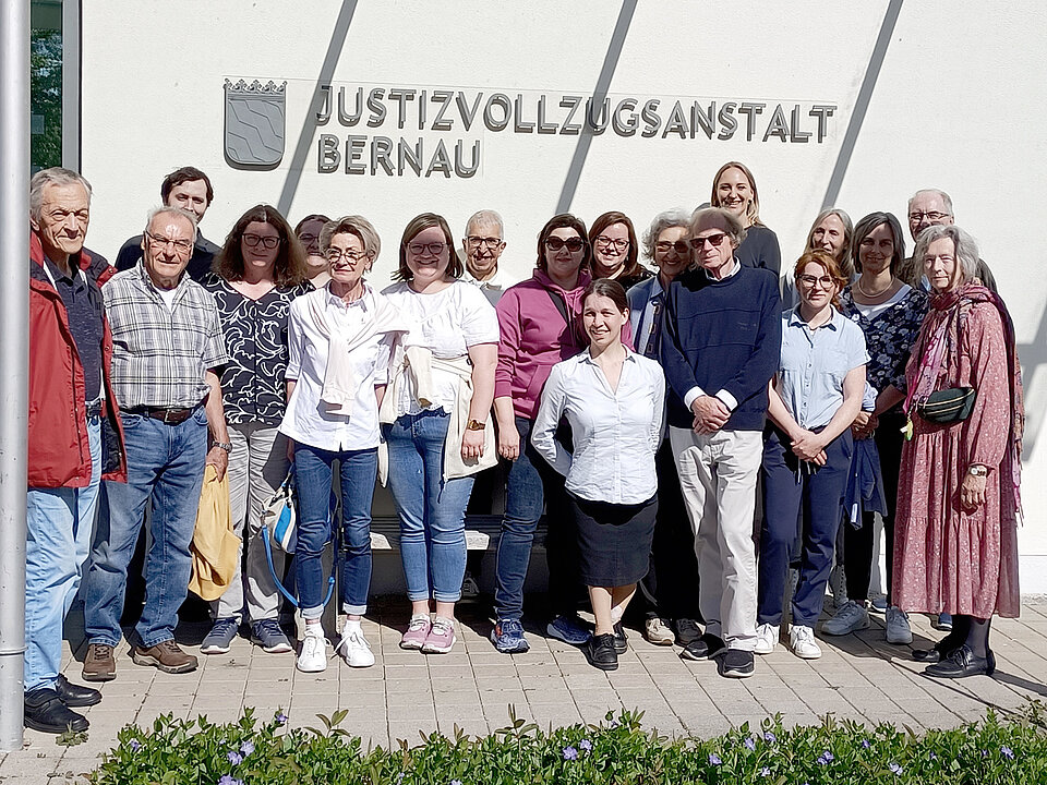 Mitte Mai trafen sich 19 Mitglieder des BBB-Kreisausschusses Traunstein-Berchtesgadener Land und des BJG-Bezirksverbands Traunstein in Bernau zu einer insgesamt 3-stündigen Besichtigung der dortigen Justizvollzugsanstalt. Durch die Anstaltsleiterin, Frau ORR. Bachhammer, wurden die Teilnehmenden zuerst anhand von Schaubildern umfassend über die JVA Bernau, zu der auch die beiden JVAs Traunstein und Bad Reichenhall gehören, informiert. In der Justizvollzugsanstalt in Bernau sind 460 Personen einzeln und 327 Haftlinge in 82 Gemeinschaftshafträumen untergebracht. Weiter gibt es vier besonders gesicherte Hafträume und acht Arrestzellen. In Bernau sind 188 Bedienstete im Allgemeinen Vollzugsdienst und 54 im Werkdienst beschäftigt. Außerdem gibt es Hundeführer für die nächtlichen Streifen mit 6 Diensthunden. Von den Inhaftierten sind 26,7 Prozent im Erstvollzug und 71,2 Prozent im Regelvollzug untergebracht.