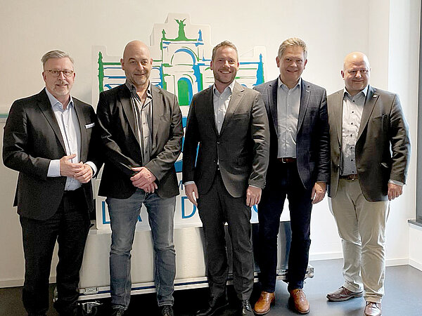 Alfred Grob, MdL, (2. v. r.), stellvertretender Vorsitzender im Ausschuss für Fragen des öffentlichen Dienstes, und Holger Dremel, MdL (rechts), im Gespräch mit BBB-Chef Rainer Nachtigall, Thomas Benedikt (mittig, JVB) und Thomas Hengl (2. v. l., LBB)