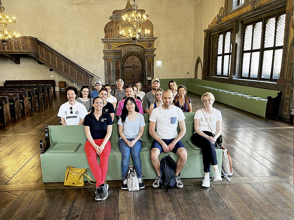 Nach einer Mittagspause an der historischen „Wurstkuchl“ ging es direkt zum zweiten Programmpunkt: Im Rahmen einer Spezialführung durch Regensburg haben sich die Teilnehmenden bei sehr sommerlichen Temperaturen mit der Zeit des immerwährenden Reichstags in Regensburg auseinandergesetzt. An dieser Versammlung, die in der Zeit von 1663 bis 1806 dauerhaft im Reichssaal tagte, haben sowohl der Kaiser bzw. dessen Vertreter, der Fürst von Thurn und Taxis, die Reichs- und Kurfürsten, aber auch Vertreter der Kirche teilgenommen und damit wichtige Entscheidungen für das Heilige Römische Reich Deutscher Nation getroffen. Diesen historischen Sitzungssaal konnten die Teilnehmenden im alten Rathaus besichtigen und die beeindruckende Atmosphäre vor Ort spüren.
